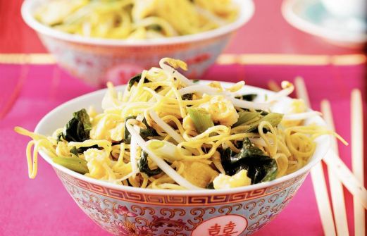 Ingrediënten 125 g Chinese eiermie 4 eieren 4 eetlepels olie 1 theelepel vijf kruidenpoeder (Chinees) 1 zakje stoneleeks ((8 stuks), in schuine stukjes) 125 g taugé ½ zak panklare spinazie (a 300 g) 1 eetlepel sesamolie zet alles op mi [...]