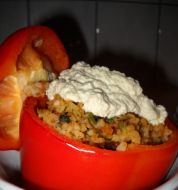 Ingrediënten 4 grote vleestomaten 2 eetlepels pijnboompitten 2 eetlepels olie 1 rode ui (gesnipperd) 1 teentje knoflook (geperst) 1 eetlepel tomatenpuree 250 g basmatirijst (voorgekookt) 2 eetlepels fijngehakte verse munt (van plantje of uit zakje) [...]