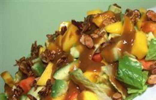 Ingrediënten Porties : 6 1 grote mango, geschild, pit verwijderd en gehalveerd 1 middelgrote papaya, geschild, ontzaad en gehalveerd 1 avocado, geschild, ontpit en in stukjes 3 eetlepels balsamico 1 eetlepel boter 4 eetlepels amandelschijfjes 1 theelepel bruine s [...]
