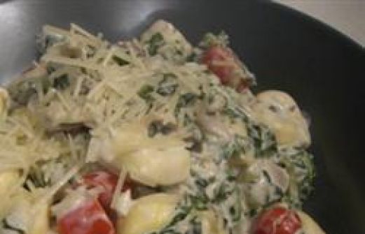 Ingrediënten Porties : 4 1 pakje (250 gr) gekoelde kaastortellini 30 gr boter 1 kleine ui, fijngesneden 1 pakje (200 gr) roomkaas 50 gr geraspte Parmezaanse kaas 125 ml melk verse champignons, in schijfjes 275 gr diepvriesspinazie, ontdooid en uitgelekt che [...]