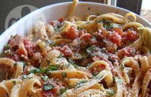 Ingrediënten Porties : 6 4 plakken rookspek of pancetta, in blokjes ½ ui, gehakt 1 teentje knoflook, fijn gehakt ¼ theel droge gemalen chili's 2 (400 gr) blikken gepelde tomaten 1 (500 gr) pak tagliatelle handvol verse basilicum, gehakt 2 eetl geraspte Parmezaan [...]