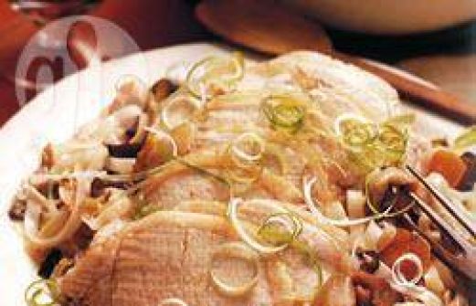 Ingrediënten Porties : 4 500 g magere, ontbeende varkensfilet met vel, stevig opgebonden 4 dl kokendhete kippenbouillon 2 eetl. donkere sojasaus 2 eetl. Chinese rijstwijn of droge sherry 2 eetl. vloeibare honing 2 tenen knoflook, geperst 15 gr verse gember, geschil [...]
