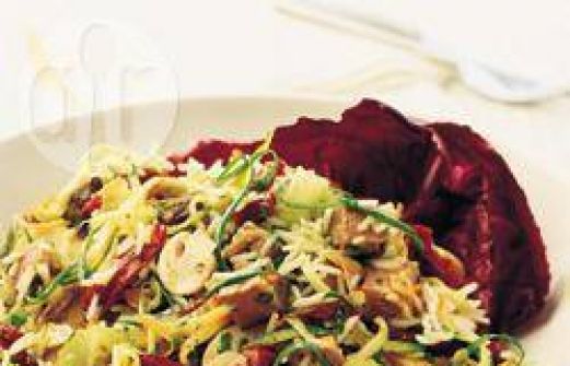 Ingrediënten Porties : 4 450 g rosbief, bij voorkeur doorbakken, zonder vet en in dobbelsteentjes van 1 cm 50 g zongedroogde tomaten in olie, uitgelekt en in dunne plakjes 4 lente-uitjes, in dunne schijfjes 2 el vers bieslook, fijngesneden 250 g basmatirijst, goed afgesp [...]