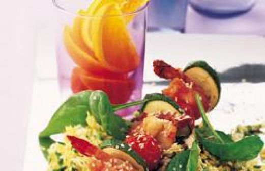 Ingrediënten Porties : 4 4 flinterdunne plakjes Parmaham, circa 50 g in totaal, zonder vet 12 grote rauwe steurgarnalen, circa 400 g, gepeld maar met de staarten er nog aan 1 courgette, in 16 schijfjes gesneden 12 kerstomaten 1 el sesamolie van geroosterd sesamzaad 1 [...]