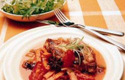 Ingrediënten Porties : 4 1 el zonnebloemolie 4 varkenslendenstukken of varkenskarbonades, à circa 150 g, zonder vet 1 rode ui, grofgesneden 2 stengels bleekselderij, fijngesneden 1 grote, rode bataat, circa 400 g, geschild en in reepjes gesneden 150 ml gezoet cranberr [...]