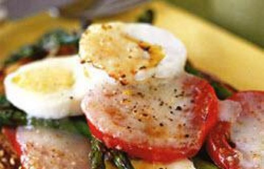 Ingrediënten Porties : 4 24 dunne (of 12 dikke) groene asperges, onderkanten bijgesneden 4 sneetjes meergranenbrood 4 theel. Dijonmosterd 8 plakjes zeer magere ham 2 hardgekookte eieren, gepeld, in plakjes 8 dunne schijfjes tomaat 2 plakjes kaas, bijvoorbeeld provo [...]