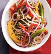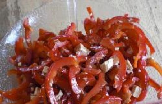 Ingrediënten Porties : 4 4 rode paprika's, in dunne reepjes gesneden 1 ui, fijngehakt 200 gr feta, in blokjes 1 teentje knoflook, zeer fijn gehakt 1 theelepel Dijonmosterd 6 eetlepels olijfolie 3 eetlepels balsamico azijn een snufje suiker 1 theelepel honin [...]