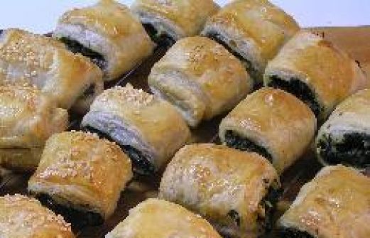Ingrediënten Porties : 36 250 gr diepvries spinazie, in een vergiet ontdooid 1-2 teentjes knoflook, fijngehakt 100 gr feta zout naar smaak olie om in te bakken 12 plakjes bladerdeeg, ontdooid 1 ei, losgeklopt met een eetlepel melk, om mee te bestrijken sesamzaad [...]