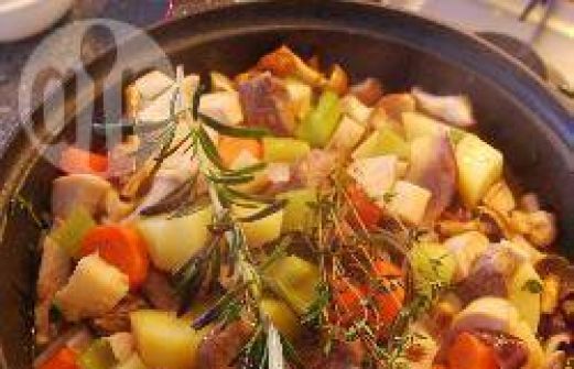 Ingrediënten Porties : 6 1 kg rundvlees (licht doorregen) 2 pastinaken 3 rode uien 4 stengels bleekselderij 4 a 5 grote wortels 5 aardappels, geschild handje rozemarijn handje tijm 200 ml fond (rund) 2 tabletten runderbouillon 4 tenen knoflook 3 ee [...]
