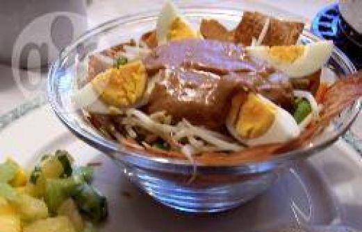 Ingrediënten Porties : 3 6-9 vellen filodeeg (ontdooid) 1/2 spitskool 5 champignons 1 winterpeen 200 gr sperziebonen 250 gr taugé 3 eieren 450 ml pindasaus (kant-en-klaar of zelfgemaakt) 2 l bouillion (van 1 tablet) 1 mango 1/2 blikje ananasstukjes (o [...]